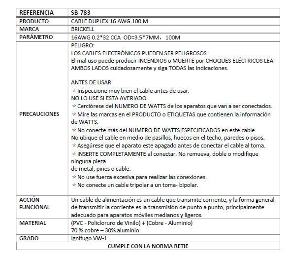 CABLE DUPLEX 2 X 16 (BK-783) (RETIE)